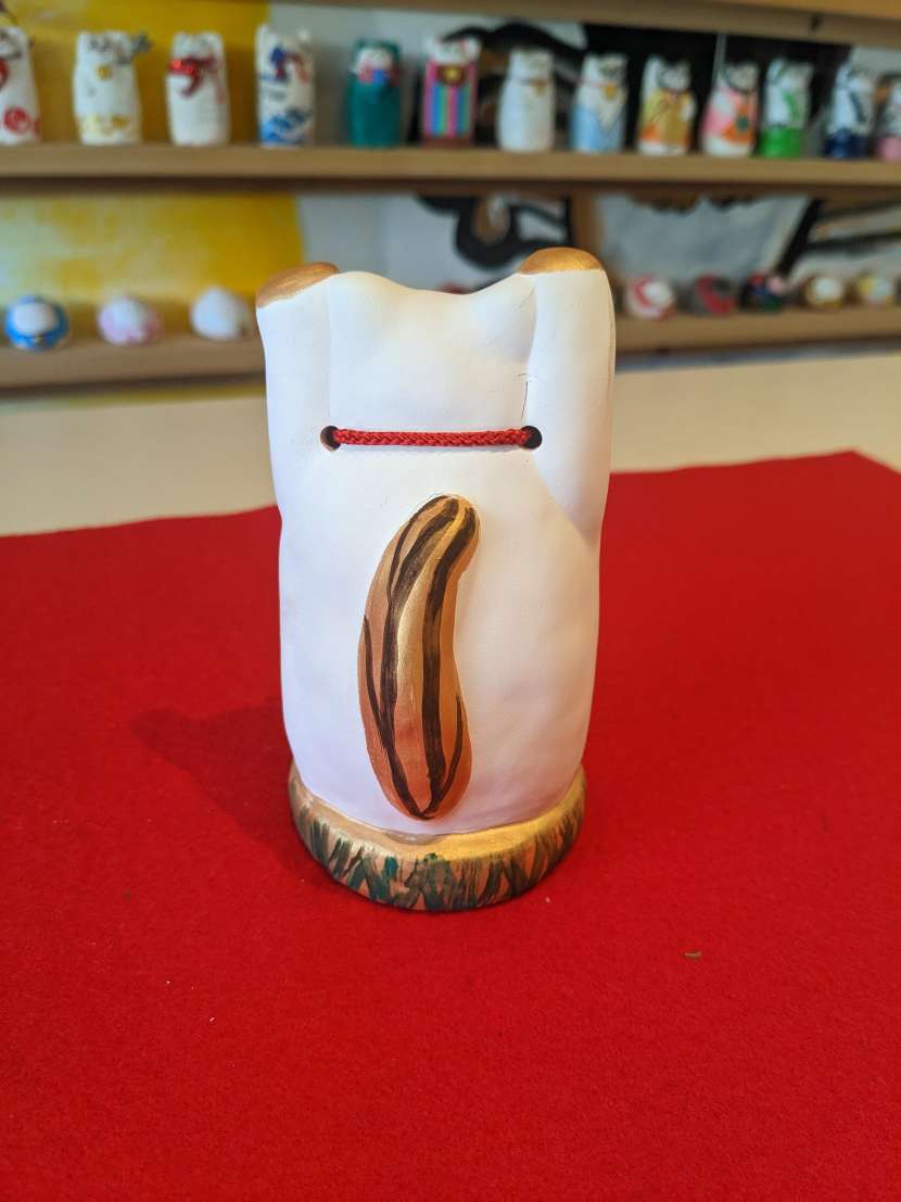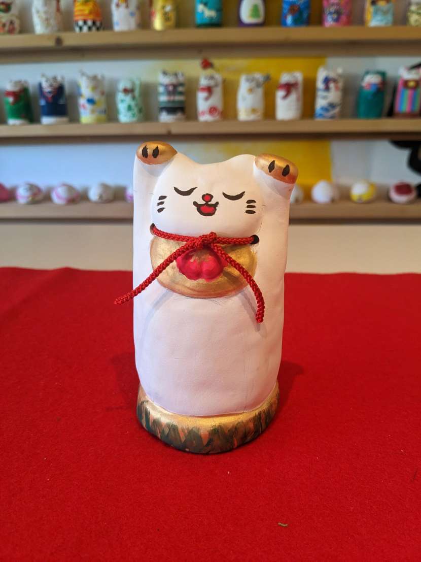 Maneki-neko with its right paw raised is said to invite wealth, while one with its left paw raised is said to invite people. A Maneki-neko with both paws raised is believed to invite good luck. Additionally, the height of the paw is also believed to have significance: a higher paw is said to invite luck from afar, while a lower paw is said to attract luck from nearby.