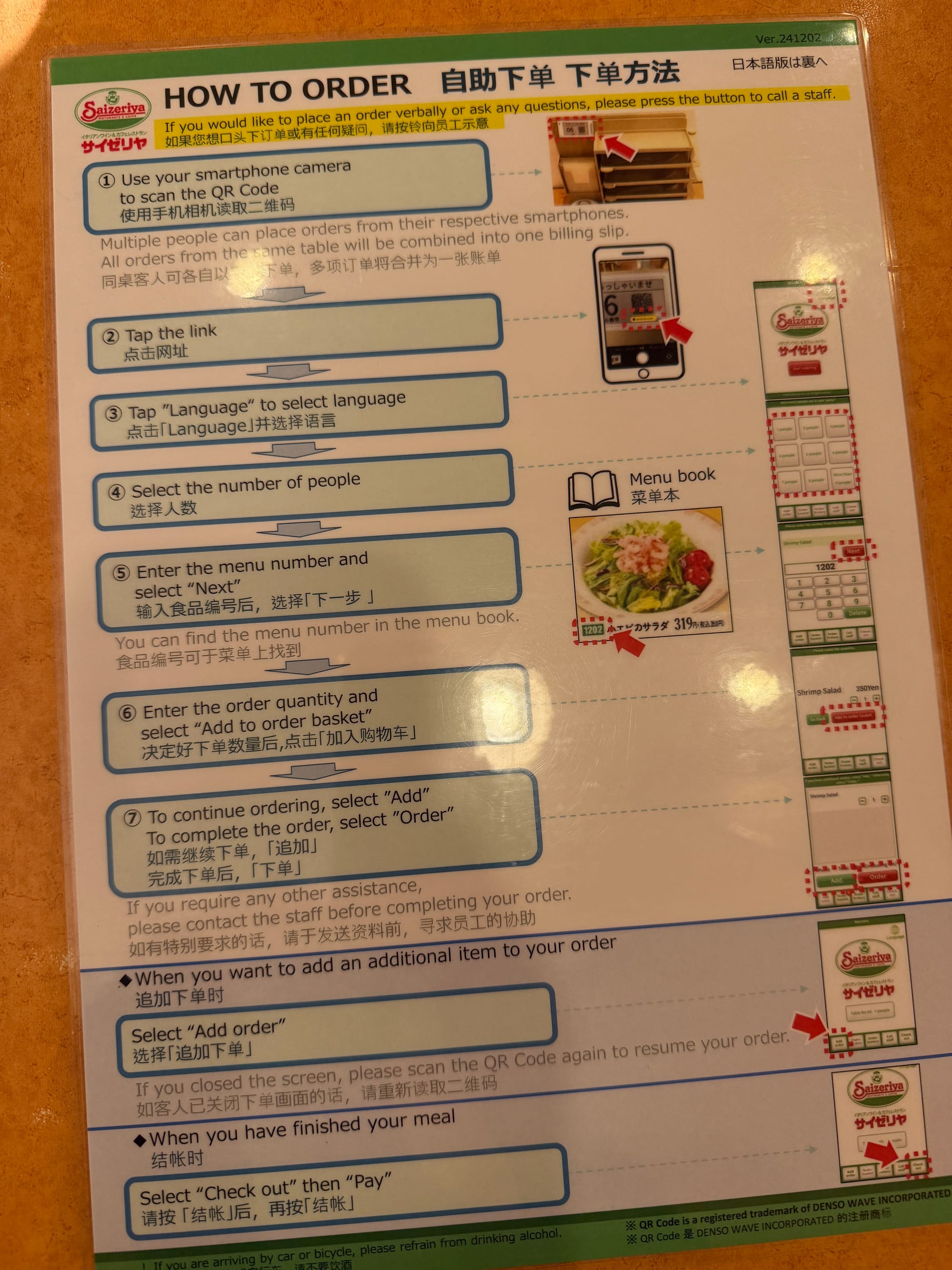 In the past, customers used to write their orders on paper. However, Saizeriya has now adopted a QR code system where you can scan the code with your smartphone to place your order. If this option isn't feasible for you, don’t worry! There’s a button on the table that you can press to call a staff member for assistance.