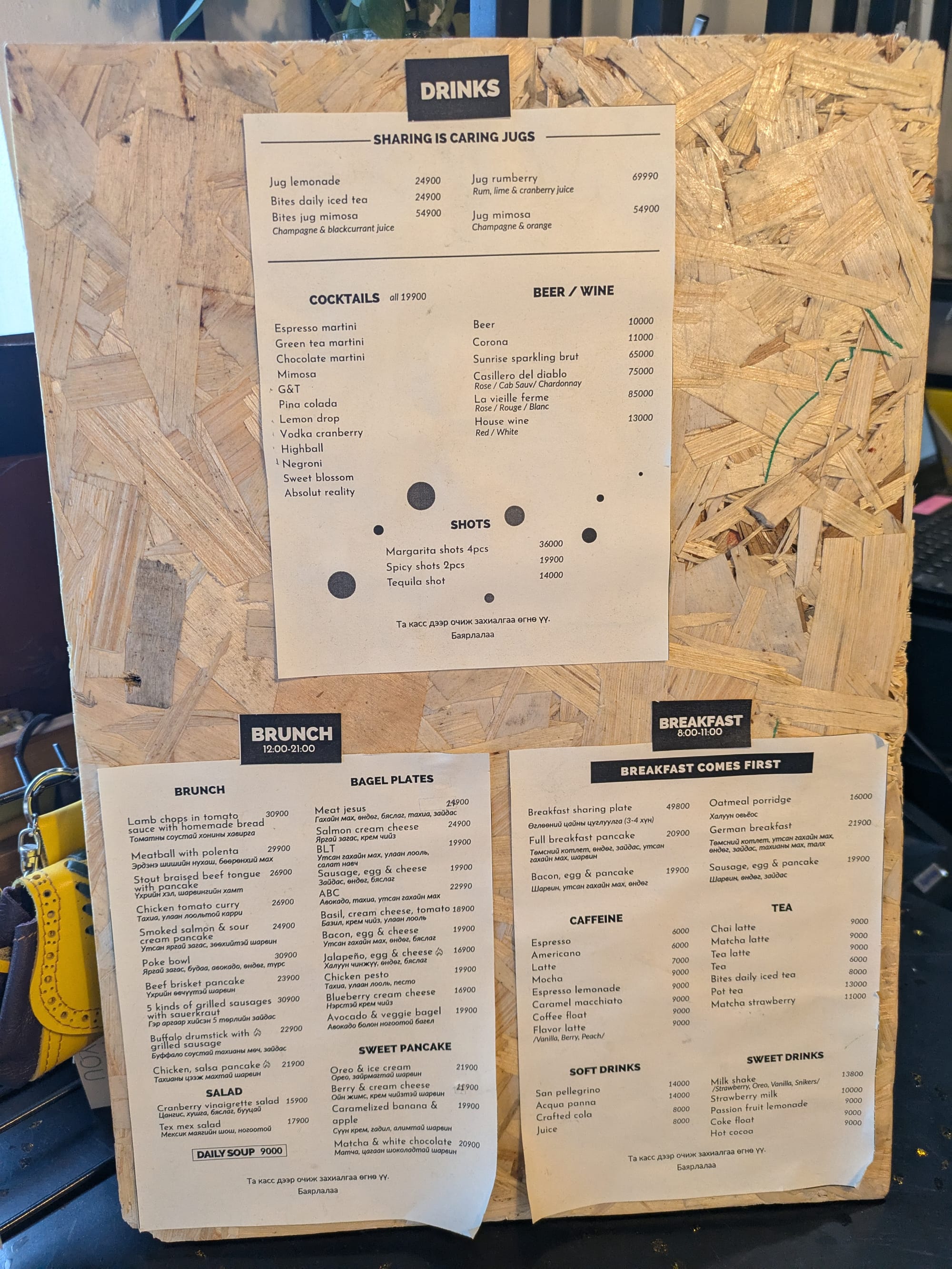 ウランバートルで一番好きなレストランです。朝食から夕食まで、どの時間帯でも楽しめるカフェ・レストランです。特にベーグルが絶品でした。BLTサンドとアボカドベーコンチキンサンド(ABC)を食べました。メニューには書いていませんでしたが、ソースがすこし辛いと感じました。マヨネーズに赤唐辛子を混ぜたような味です。とてもおいしいですが、苦手な方は、注文時に確認したほうがいいと思います。パンケーキも人気がありそうでした。