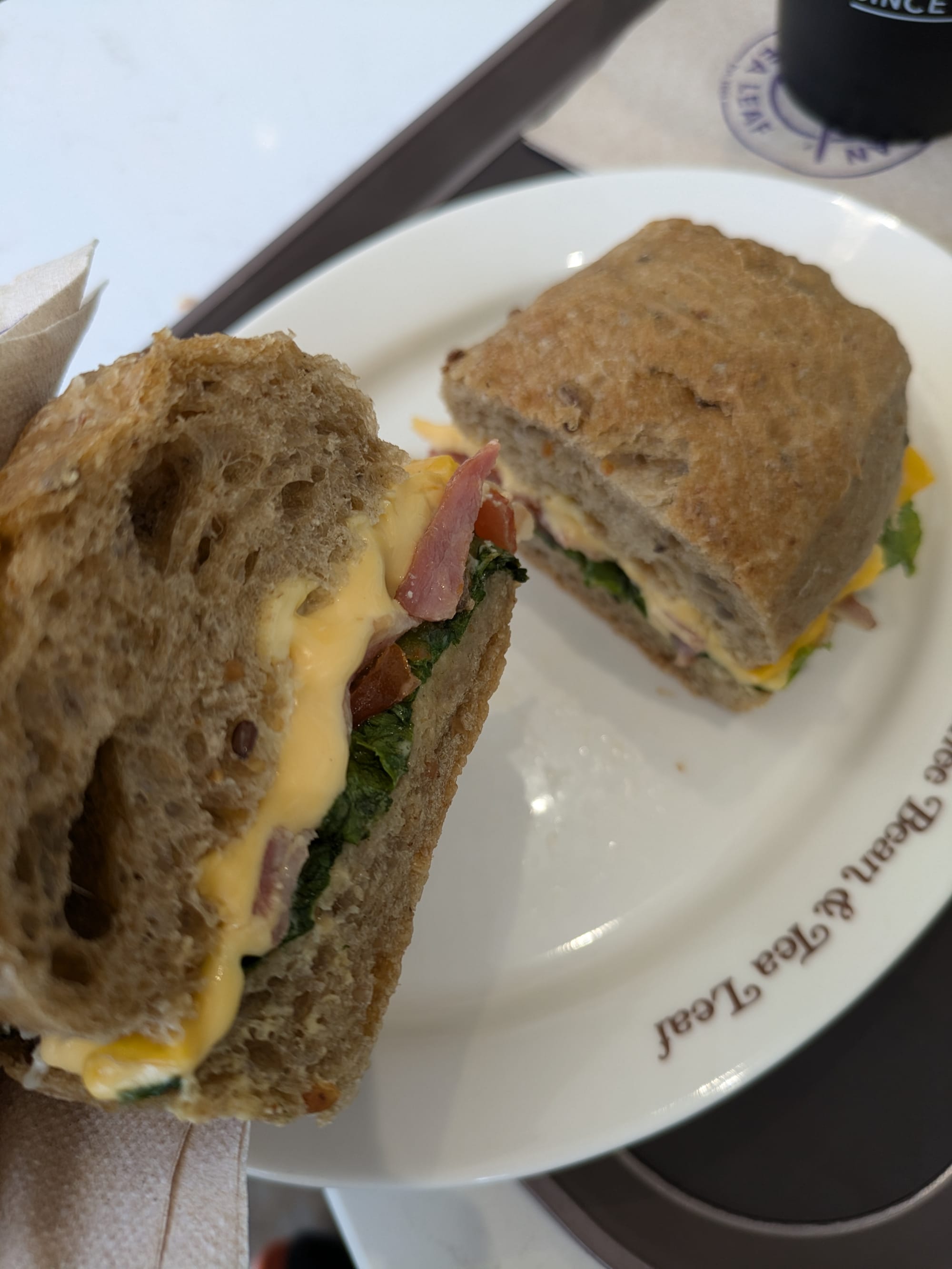 たまたま通りかかったカフェで朝食セットを食べました。時間帯によってはお得な朝食セットがあります。店内はチルい洋楽が流れていました。アメリカから来た人は「ああ、ホームだ」と感じると思います。アメリカ発祥のチェーン店だそうです。サンドイッチは温めてくれるか聞いてくれましたし、大きかったので二等分してもらうように頼むと快く切ってくれました。若い店員さんだったので英語でのコミニュケーションはスムーズでした。